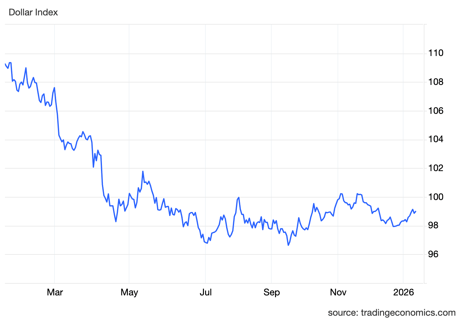 Dollar: The DXY is testing 14-year support. If it breaks below 96-97 on a sustained basis, the next technical level is somewhere around 92-94. That would be a seismic shift in global currency markets.