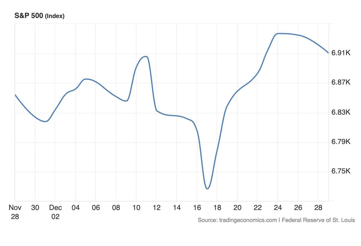 The rally delivered. On Christmas Eve, the S&P 500 officially breached 6,900, closing at 6,909.79 and marking its 39th record close of the year. By Friday, December 27, the index had climbed to 6,929.94—hovering just shy of the psychological 7,000 level.