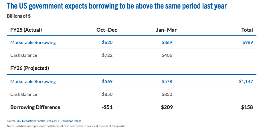 The U.S. Treasury just announced it needs to borrow $1,147 billion across Q4 2025 and Q1 2026—that's $158 billion more than the same period last year. We're talking about nearly $200 billion in fresh debt issuance per month, every month, for the foreseeable future.