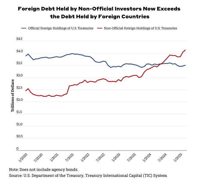 Foreign holdings of U.S. Treasuries have dropped from 50% in the early 2010s to just 30% today. China has been systematically reducing its Treasury holdings since 2014, now sitting at just $700 billion. Even that number overstates their commitment—much of it is legacy positioning they're working to exit.