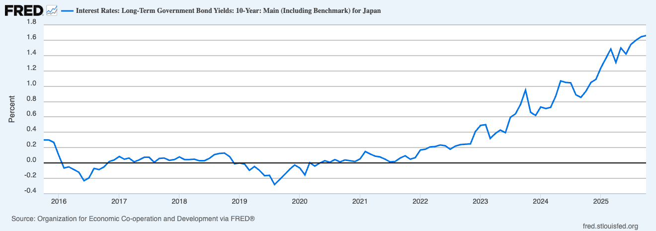 All three assumptions are now breaking simultaneously. Japanese inflation hit 3.1% year-over-year—well above the BOJ's 2% target—and has stayed elevated for over three years. The central bank raised rates to 0.5% in January 2025, the highest since 2008, and markets expect more hikes coming.